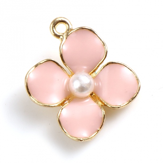 Zinklegierung & Acryl Charms Blumen Vergoldet Pfirsichrosa Emaille Imitat Perle 17mm x 14mm