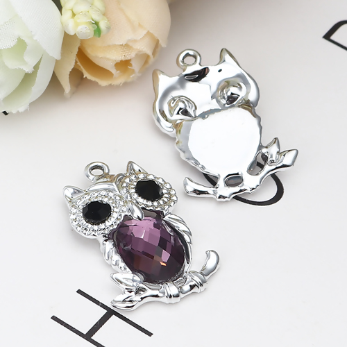Zinklegierung & Glas Halloween Anhänger Eule Versilbert Lila Schwarz Strass 30mm x 20mm1 Stk