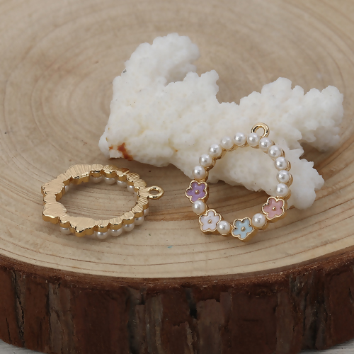 Zinklegierung Charms Ring Vergoldet Weiß Blumen Imitat Perle Emaille 22mm x 20mm