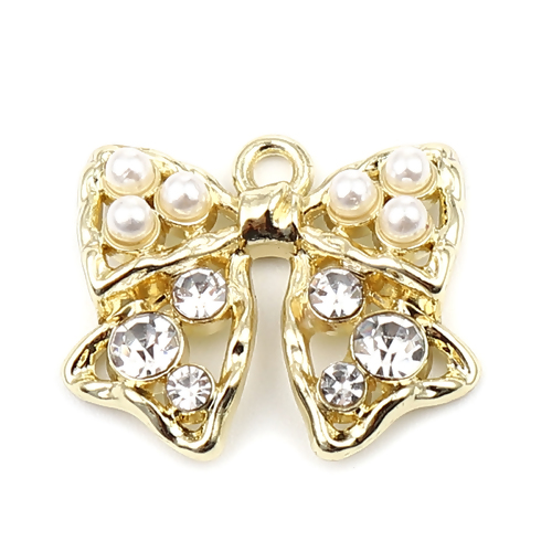 Zinklegierung Charms Schleife Vergoldet Weiß Transparent Strass Acryl Imitat Perle 22mm x 18mm