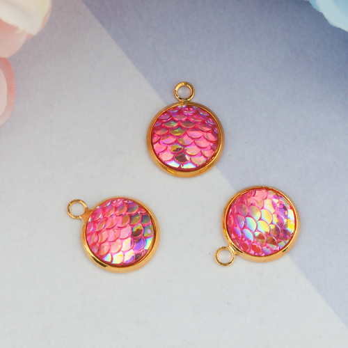 Kupfer & Harz Meerjungfrau/Drachen Fischschuppen Charms Rund Vergoldet Fuchsie, 16 mm