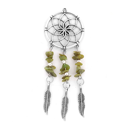 Zinklegierung Traumfänger Anhänger Chip Perlen Antiksilber Gelbgrün Feder 10.5cm x 3.5cm