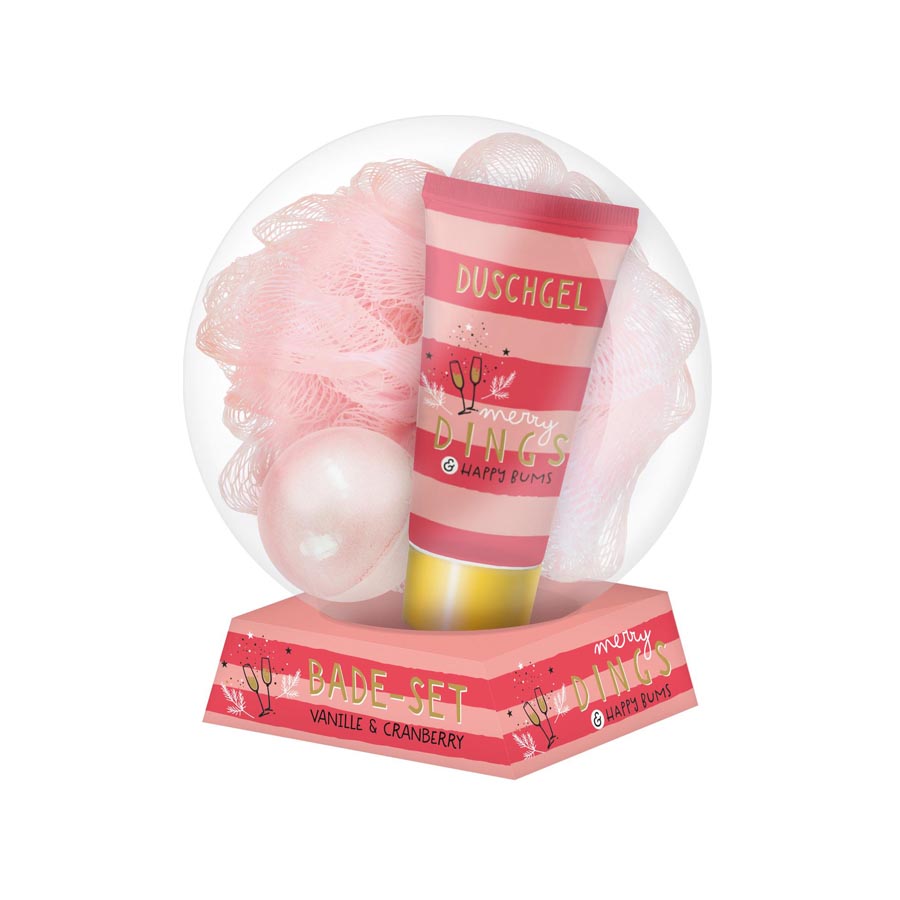Kugel, 12 cm, mit Dusch.Netzschwamm, Badekugel, 30 g. und Duschgel 30 ml. Duft: Vanille & Cranberry