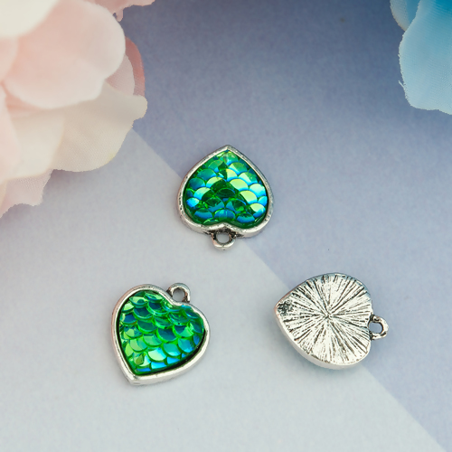 Zinklegierung & Harz Meerjungfrau/Drachen Fischschuppen Charms Herz Antiksilber Grün ,16mm x 14mm