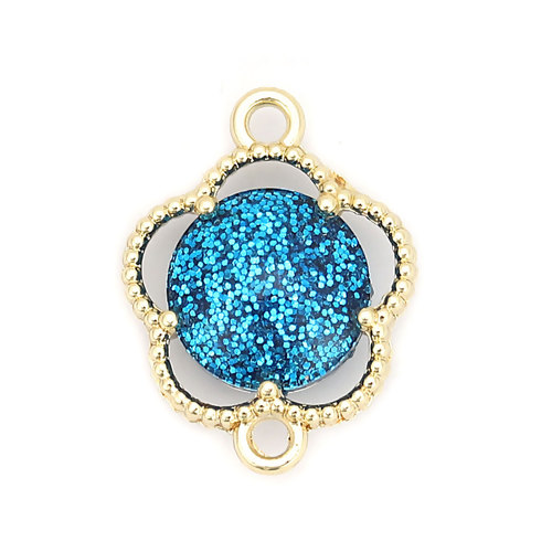 Kupfer + Glas Verbinder Pflaumenblüte Vergoldet Blau mit Rund Muster Glitzert, 16mm x 12mm1 Stk