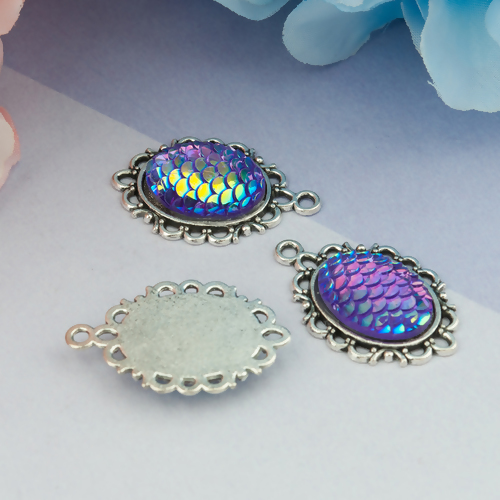 Zinklegierung & Harz Meerjungfrau/Drachen Fischschuppen Anhänger Oval Antiksilber Lila, 31mm x 20mm