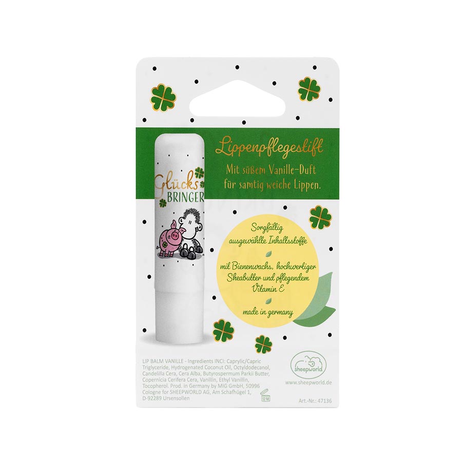 Lippenpflegestift in Geschenkbox, Motivdruck: Glücksbringer, Duft: Vanille, mit Bienenwachs, hochwertiger Sheabutter und pflegendem Vitamin E