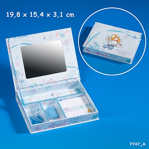 Spiegelbox, 20 x 15 cm mit Bleistiften, Gummi, Klammern und bedr. Zetteln