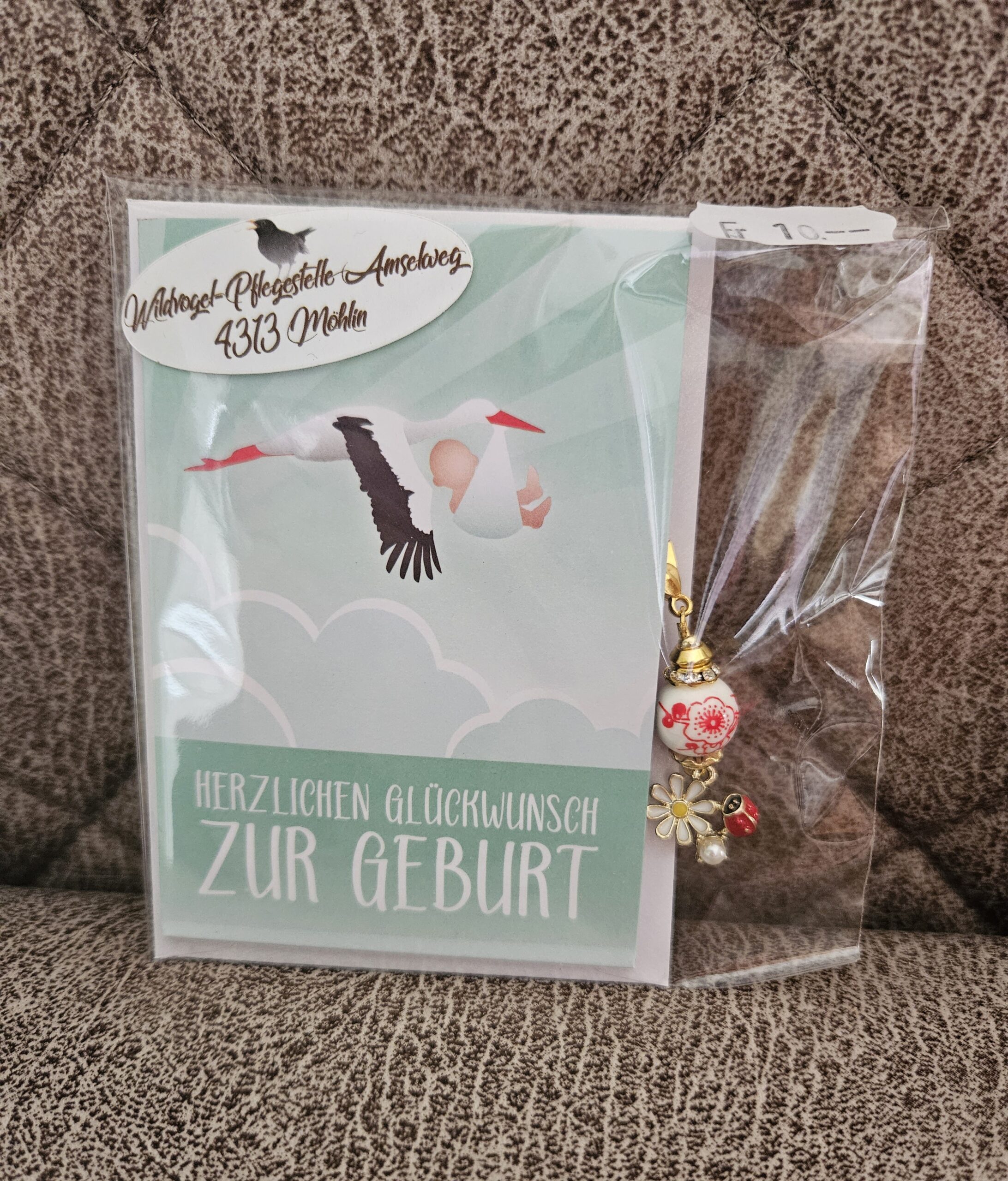 Doppelkarte mit Couvert, 7.5 x 10.5 cmmit Pop-up Storch / Geburt, inkl. Anhänger rot