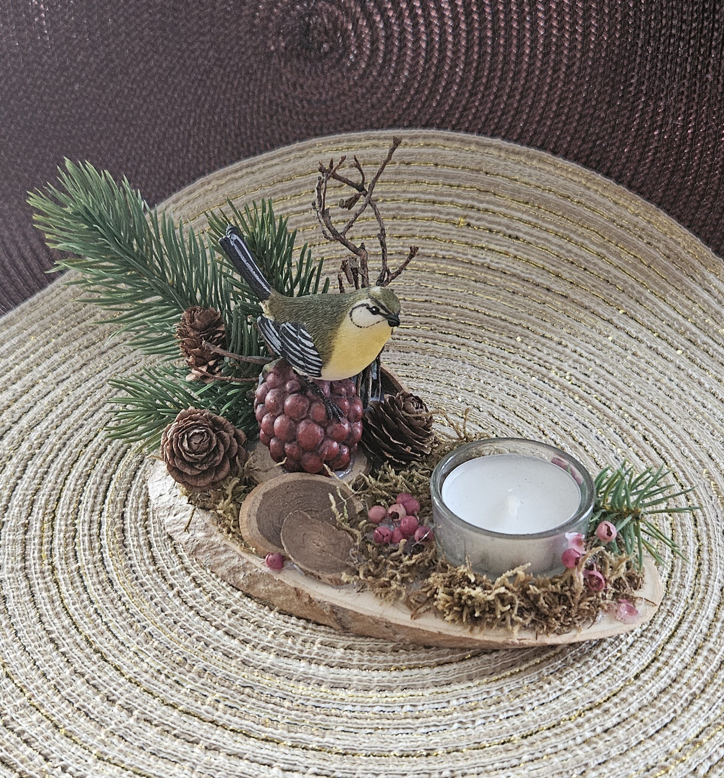 Holzscheibe ca. 18 cm mit Deco und TeelichtHandarbeit